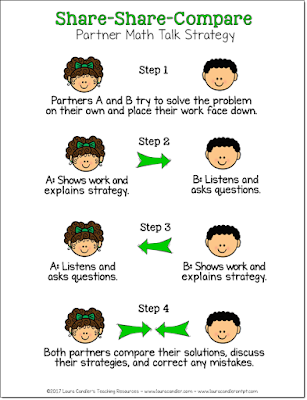 You can avoid these problems entirely by implementingย Share-Share-Compare, a simple cooperative learning strategy to facilitate math partner talk. I described this strategy in detail during theย Math Problem Solving: Mindsets Matterย webinar, and you can see the steps illustrated on the right. This mini-poster is one of the resources included with that webinar or the one of the bundles that includes the webinar.
