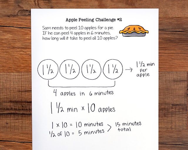 To illustrate this point, ask your students to solveย Apple Peeling Challenge #2:ย “Sam needs to peel 10 apples for a pie. If he can peel 4 apples in 6 minutes, how long will it take to peel all 10 apples?”